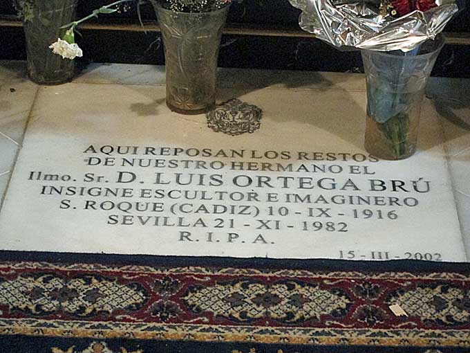 Este es el caso de la tumba de Ortega Brú , está en el anteriomente mencionado templo de San Andrés de Sevilla, concretamente en la capilla de los Sagrados Titulares de la Hermandad de Santa Marta , cuyo genial misterio salió de su genial gubia . ( excepción hecha de la Virgen de las Penas y Santa Marta que son de Sebastian Santos ) , por ese motivo no lo pude publicar en Noviembre pasado, pudiendo fotografiarla después, y al tratarse de un escultor muy presente en nuestra Semana Santa ( La Cena, Santa Marta, San Gonzalo, La Bofeta , El Baratillo y la Macarena - VER - ) he estimado oportuno incluirla en este tiempo de Cuaresma .-