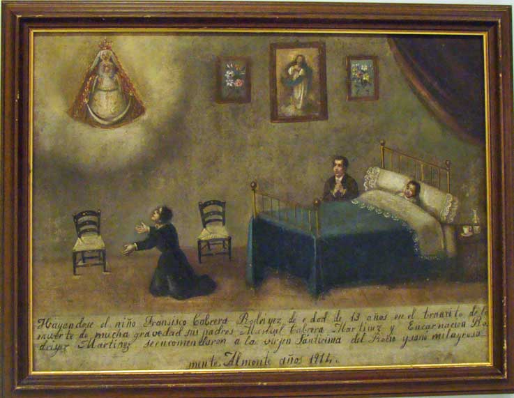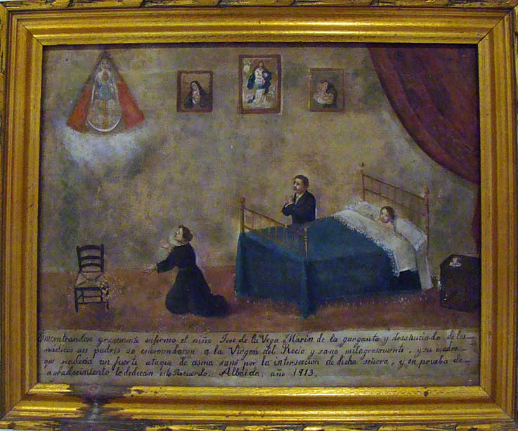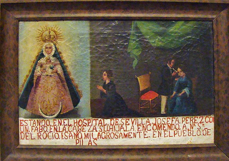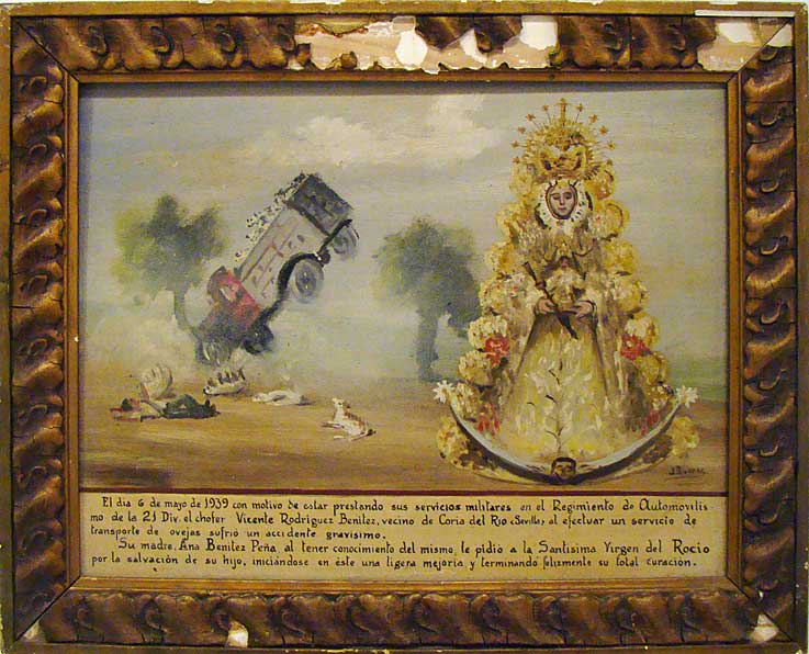 La estructura es siempre la misma, una pintura que podríamos catalogar como naif, donde aparece el enfermo o accidentado, familiares implorante , la Virgen del Rocío y una texto con una viñeta donde se relata el suceso, la invocación, el feliz resultado, el lugar y la fecha .-