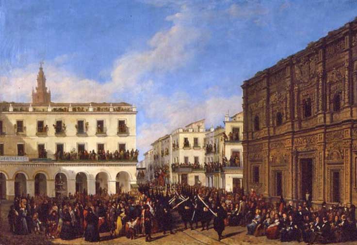 26 de Julio de 2015 El pintor Joaquín Domínguez Bécquer, nace en Sevilla, en 1817. Formado en la Escuela de Bellas Artes de Sevilla, fue encargado por la corte de Isabel II de las labores de dirección de los trabajos pictóricos realizados con ocasión de la restauración de los Reales Alcázares de Sevilla, lo que le valió ser nombrado pintor honorario de cámara y maestro de dibujo de los sobrinos de la reina. Máximo representante de la pintura costumbrista sevillana entre su producción pictórica destacan sus obras con tema sevillano como : La Plaza de la Maestranza de Sevilla, la Vista de Sevilla desde la Cruz del Campo y La Feria de Sevilla. También realizó retratos y obras con temática histórica pero de mucho menos nivel artístico. Su obra se encuentra representada en el Museo de Bellas Artes de Sevilla. Era primo del también pintor costumbrista José Domínguez Bécquer y, por lo tanto tío de sus hijos, el poeta Gustavo Adolfo Bécquer y del también pintor Valeriano Domínguez Bécquer.- Murió en Sevilla tal dia como hoy un 26 de Julio de 1879 .-