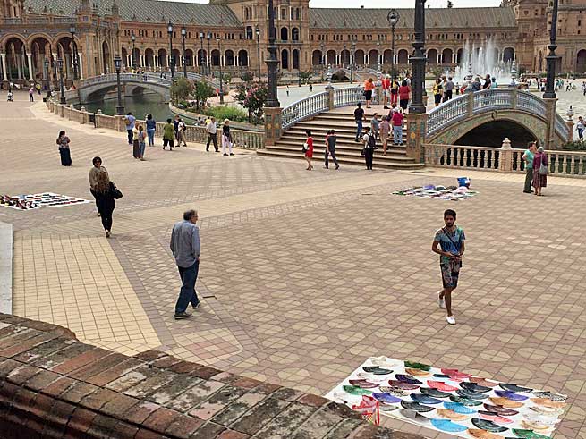 Toda esta venta variopintos y multicolores cachibaches made in china de abanicos, castañuelas, y demás souvenir, los podrian regularizar y desplazar a otras zonas del parque y no precisamente dentro de un museo cerámico al aire libre como nuestra Plaza de España , algo que sería impensable en otros monumentos europeos, o poner una cartel en cada una de sus torres donse pueda leer una obviedad : " Prohibida la venta ambulante en todo este monumental recinto" .- Esto no es La Sevilla que no vemos, es desgraciadamente La Sevilla que SI vemos , esto que ven en las fotos puede competir con el mercadillo del Parque Alcosa o del Charco la Pava .- |