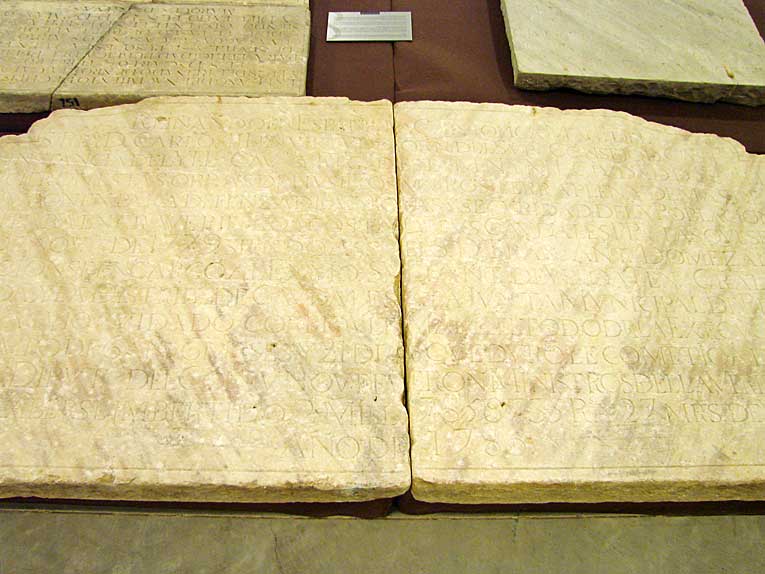 Entre otras piezas nos encontramos con esta lápida de mármol de la Puerta de la Barqueta de Sevilla . Las continuias crecidas del Gudalquivir suponía un verdero problema para la ciudad . Las puertas de las murallas estaban continuamenre reforzandose para evitra en la medida de los posible la entrada del agua .-