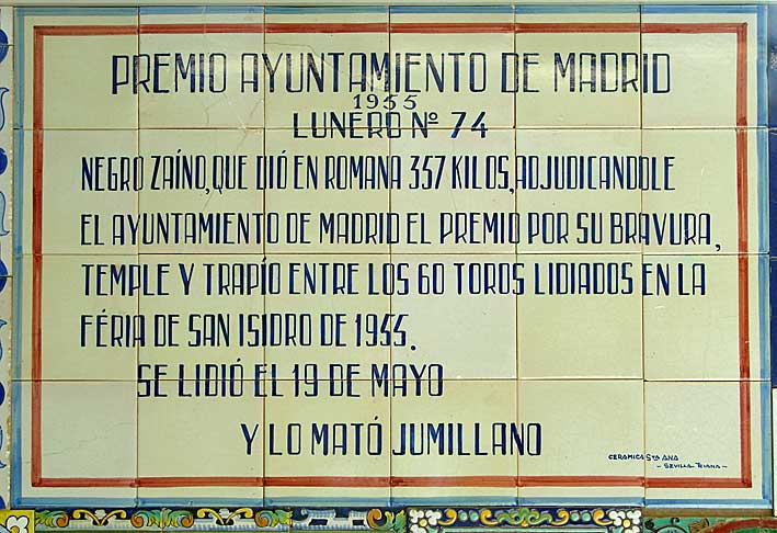 13 de Junio de 2015 Hace ya un tiempo hice una visita al Centro de Cerámica de Triana es un espacio museístico creado en el año 2014 por el ayuntamiento de Sevilla, con la colaboración de la junta de Andalucía, cuyo fin es mostrar a sus visitantes la tradición cerámica de la ciudad; cosa que se podrian haber ahorrado pues toda Sevilla en si, es un inmenso museo al aire libre y de balde , de retablos y lienzos cerámicos ( la maltratada Plaza de España ni les cuento ) .- El caso es que al final de la visita hay como un inmeso collage de azulejos de toda indole, nombres de calle, publicitarios, refranes , etc ; y entre ellos estaba este que ven en la parte superior, que me llamó la atención por ser su destinatario un premio taruino del Ayuntamiento de Madrid donde se premiaba a un toro lidiado en San Isidro de 1955 , sinceramente resultó curioso .- Por aquello de que San Isidro 2015 finalizó la semana pasada, y un servidor es totalmente taurino de una forma social y politicamente incorrecta , vi un documental que me hizo recordar lo que ven en la foto .- Efectivamente, la Venta