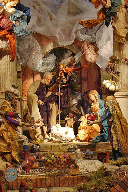 Bajo una ornamentación plateresca, destacan algunas escenas, como el pesebre coronado por una corte de ángeles de gran hermosura, el Cortejo de los Reyes Magos, la banda de músicos turcos que acompaña a sus Majestades los Reyes Magos y la Anunciación de los Pastores. En cuanto a las figuras, la colección de esculturas, propiedad de la Fundación Cajasol en su mayoría, la conforman piezas de 35 centímetros de altura.-