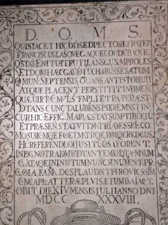 “D.O.M.S. Aquí yace nuestro amado hermano Fr. Francisco Laso de la Vega y Córdoba, hijo ilustre de la religión Guzmana, de quien esta casa se gloría ser madre. Obispo de Ceuta y de Plasencia, el cual dando cuanto tenía a los templos y menesterosos, quedó pobre; y finalmente quiso posar en este lugar a la vista de la imagen de la Virgen nuestra Señora, suyo altar había erigido, mandando que en cualquier parte donde le cogiese la muerte, fuesen trasladados sus huesos a esta casa y sitio. Por lo que esta pobre comunidad, agradecida al hijo que la enriqueció, aún no queriendo él, le consagró este monumento; así que la gloria, la fama y el honor unidos, llevara su memoria hasta los cielos quedando en la tierra mas que sombra y polvo. Murió el día 14 del mes de julio del año del Señor de 1738”.