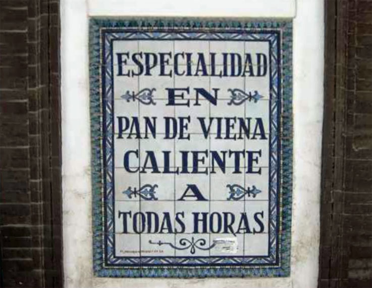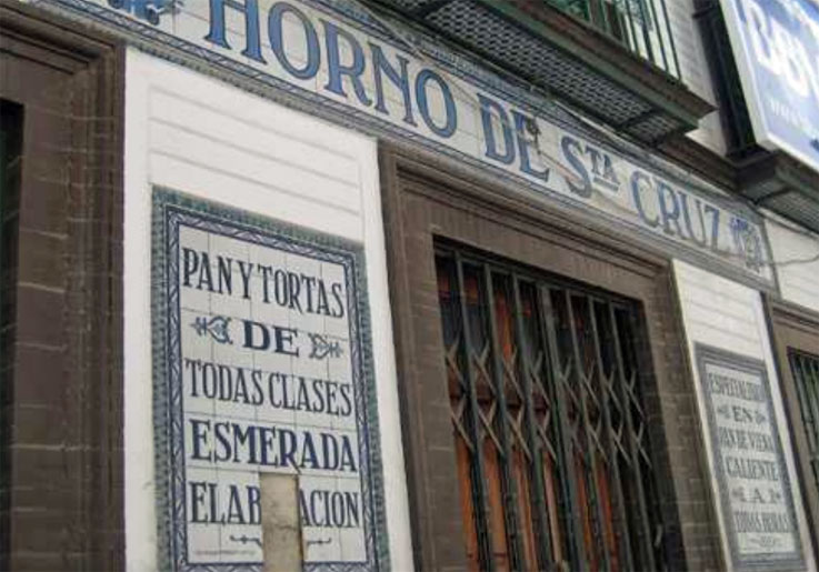 Eran de ese tipo de azulejos donde el texto se convierte en un reclamo seductor al cantra las excelensias del producto y elogiar las bondades de la mercancia . como puden apreciar no hay imágenes . desde la fachada del Horno de Santa Cruz se soliicta la atención de los transeuntes con las siguientes frases "ESPECILAIDAD EN PAN DE VIENA CALIENTE A TODAS HORAS " o "PAN Y TORTAS DE TODAS CLASES . ESMERADA ELABORACIÓN" .- Obra de Mensaque Rodriguez y Cia , a la cuerda seca de 105 x 75 cm cada uno y fechados entre 1950 y 1955 . Pues ya los pueden tachar de nuestro patrimonio .-