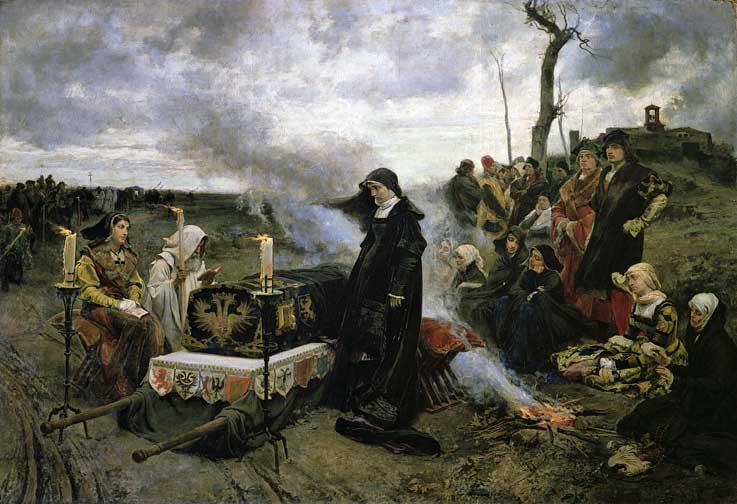 La reina mas mal querida y desdichada de la Historia de España, Juana la Loca, ante el ataud de su marido Felipe el Hermoso de riguroso luto NEGRO |