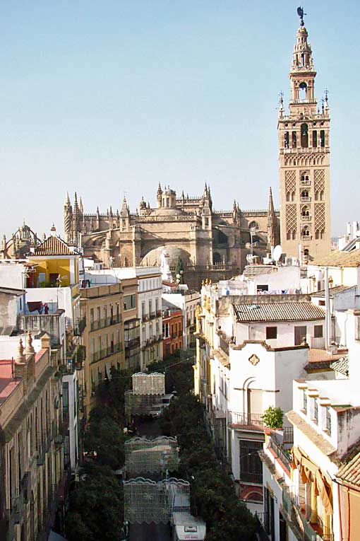 En la foto superior tiene una panorámica de la calle Mateos Gago , así como de la Catedral y la Giralda de Sevilla .-