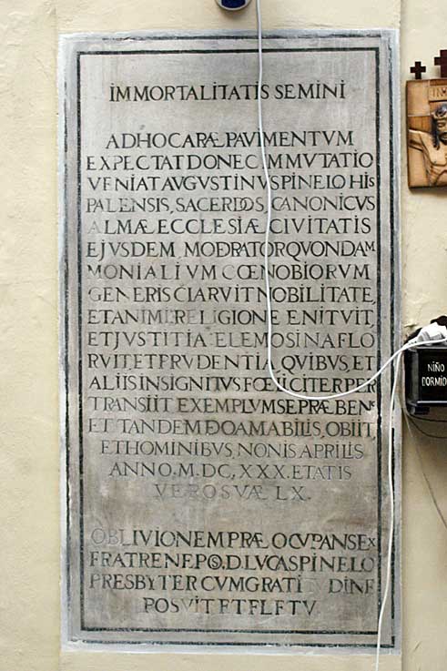Hoy visitamos la Iglesia del Convento de San Leandro donde en una de sus paredes hay una lápida funeraria de importantes proporciones y largo epitafio en latín ( cable de la luz incluido) de D. Agustín Pinelo , de la poderosa familia Pinelo que tiene enterramiento propio en la Capilla del Pilar de la catedral y de ascendencia genovesa .-