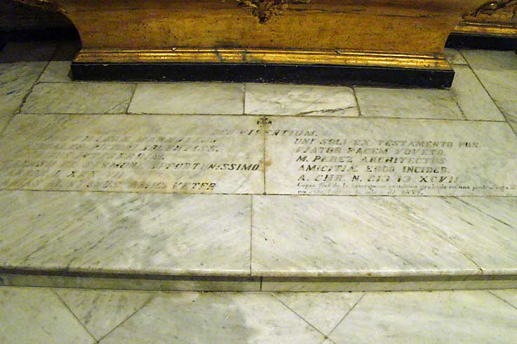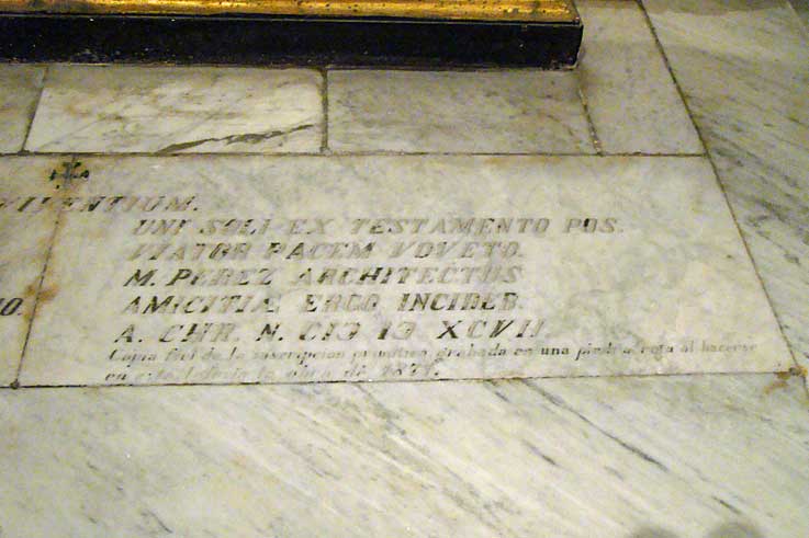 AL DIOS DE LOS VIVIENTES. PEDRO VILLEGAS MARMOLEJO PINTOR SEVILLANO DE GRAN INGENIO Y SANAS COSTUMBRES DE CONOCIMIENTO Y DISCURSO MUY APROPIADO VIAJO A LA PAZ A SUS 87 AÑOS Y SU VIEJO AMIGO ARIAS MONTANO SEGÚN LO PROMETIDO EN SU TESTAMENTO HIZO QUE EL ARQUITECTO M.PEREZ ESTO GRABARA EN HONOR DE SU AMISTAD AÑO DE NUESTRO SEÑOR DE 1597 .