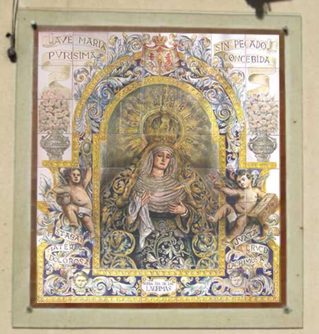 En el Muro de los Navarros de Sevilla, en la Casa Hermandad de la Exaltación nos encontramos con este bello retablo cerámico. Representa a uno de sus Sagrados Titulares, Nuestra Señora de las Lágrimas,. La imagen se enmarca en una hornacina vegetal figurada con ornamentación vegetal, angelotes y elementos alusivos a dicha cofradía . Uno de ellos lleva entre sus brazos la torre de Santa Catalina
