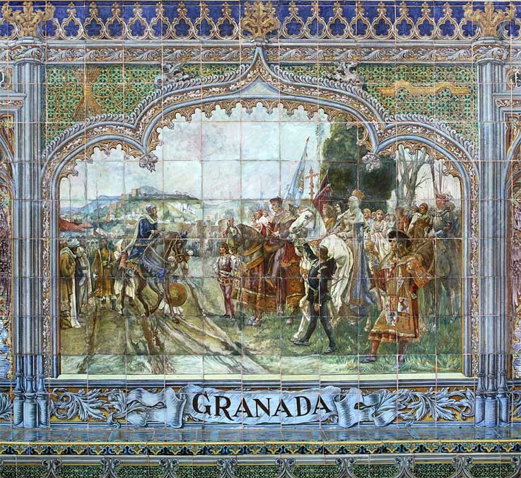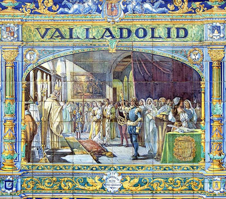 Fernando el Católico que fue la inspiración de Maquiavelo, para su Principe, todo un tratado y manual de alta politica. Aqui les dejó unos azulejos de nuestra Plaza de España , con los momentos claves de su vida y de nuestra Historia . Los reyes catolicos, no solo visitaron sino residieron en Sevilla, en el Alcazar, tuvieron un hijo aquí , fundaron conventos , etc