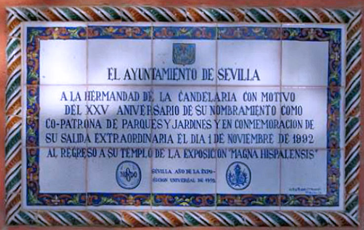 En el Paseo de Catalina de Ribera en la murallas de los Reales Alcazares de Sevilla nos encontramos este curioso azulejo de doble conmemoración. Por un lado, el Ayuntamiento de Sevilla conmemora el veinticinco aniversario del nombramiento de la Virgen de la Candelaria como co-patrona de parques y jardines.-
