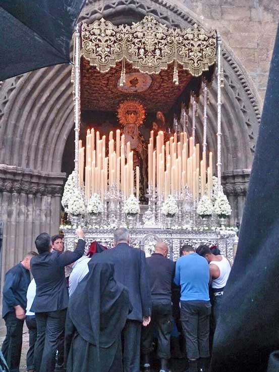 23 de Marzo de 2016 Ayer se dió un master de lo que NO tiene que hacer una junta de gobierno cuando amenaza lluvia .- NO se puede sacar una Hermandad como el Cerro, a una velocidad de crucero de paso de mudá ( enhorabuena a los que fundieron la candelaria, al superar este permanente retranqueo sin que se cayera ninguna ), para al final acabar con la procesión rota el Misterio en la Catedral, y el palio irrumpiendo en un lugar donde otra Hdad estaba preparada para salir, como los Estudiantes en el rectorado. Para después tener que ir en busca del resto de la cofradia, y quedarse en el templo catedralicio, para regresar a primeras horas de la mañana y sin música otro día de nuestra Semana Santa . Para eso es mejor no salir .- NO se puede sacar una Hermandad , sin que su junta de gobierno olvide algo tan básico como mirar al cielo, los Javieres y San Benito, salieron chispeando, y a los pocos minutos de la salida se pusieron impiamente chorreando , y tuvieron que volverse . De la insensatez humana no se puede responsabilizar a Dios .Para eso es mejor no salir .- NO se puede sacar una Hermandad como San Esteban , continuar los pasos a pesar de los continuos pequeños chaparrones, para acabar refugiandose en la Anunciación, y al final regresar a casa . Para eso es mejor no salir .- Algo mas peligrosos que las distantes vallas anti-bullas , que han motivado que popularmente nuestro alcalde de Juan Espadas, haya sido rebautizado por el pueblo sabio y soberano como "Juan Vallas" , son los incomprensibles modificaciones de horarios e itinerarios, una vez que las junta de gobiernos temerarias deciden poner chorreando a su patrimonio material y humano . Si se sale, se sale a su hora, con todas, las consecuencias y por su itinerarios oficial ¿ Para eso un año de planificación, cabildos de toma de horas , lucha cronométrica por tiempos de pasos ?, para al final todo quedar reducido en minutos a un : "Yo salgo a la hora que quiero, y me voy por donde me da la gana" . Cuidado con esto .- Un Martes Santo para olvidar, y sobre todo no repetir nunca .- El palio del Cerro saliendo del rectorado Los Javieres que estrenaban este ño una interesante la imagen de San Juan , se mojaron y volvieron al poco de salir San Esteban refugiandose bajo la lluvia en la Iglesia de la Anunciación ( El Valle ) , con el manto cubierto entre plastico Los Estudiantes prudentemente decidiron no salir y lo comunicaron en su oportuno momento sin esperas Tan triste como