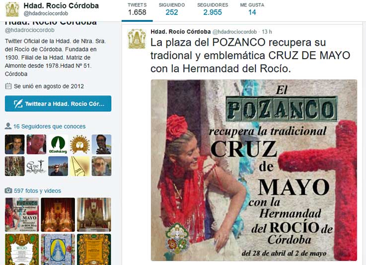 20 de Abril de 2016 Uno cuando esta montado en la barquita de la ria de la Plaza de España y se pone a navegar por las redes , por casualidad se encuentra con cosas como estas .- Como ven es un cartel de una Cruz de Mayo de la Hermandad del Rocío de Córdoba anunciado para este año , en internet y el perfíl de la mencionada Hermandad tanto de Facebook como en Twitter, como puden comprobar en estas capturas de pantallas de ayer mismo :