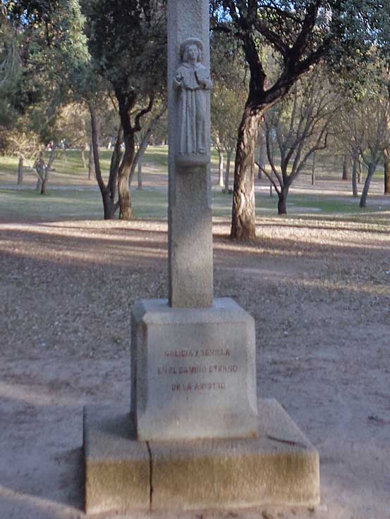 Hoy nos vamos al parque del Alamillo, nuestra "Expo del 92 permanente" en los que a regiones españolas se refiere, encontrandonos con una segunda réplica de un cruceiro gallego. Se trata de un monumento realizado en granito, compuesto como ven por una grada y pedestal, donde puede leerse la siguiente inscripción: "Galicia y Sevilla en el camino eterno de la amistad, 2005". -