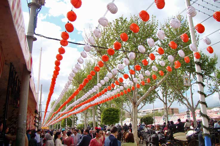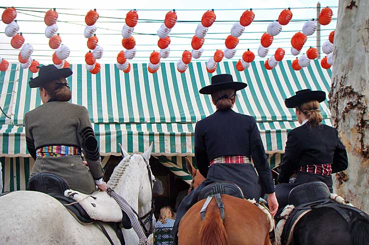 Por tercer año consecutivo las integrantes de la Asociación Andaluza de Monta de Amazona , protagonizaron un nutrido paseo por Sevilla reivindicando la clásica estampa de las amazonas Extraños carruaje, aunque sin duda valioso un MAIL COACH , coche donde además de viajar pasajeros tanto dentro de la caja ,como en el techo también lo hacia el correo y los empleados del mismo, pero mas propio del rodaje de una pelicula inglesa de época que de nuestra Feria La Feria que desde el martes no llovía , con una temperatura perfecta de 0º ( ni frio, ni calor ) , incluso se llegó a reponer parcialmente los farolillos , destrozados por las primeras lluvias, pero con los farolillos ocurre como con ciertas cruces de guía , que son un imán para el agua Tras una tarde tan primaveral como esplendorosa, y en momentos luminosa, a primeras horas de la noche vino el diluvio Un año mas la mágnifica