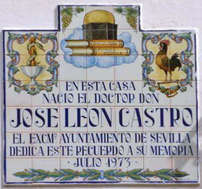 "En esta casa nació el doctor Don José León Castro. El Excmo.Ayuntamiento de Sevilla dedica este recuerdo a su memoria. Julio 1973"