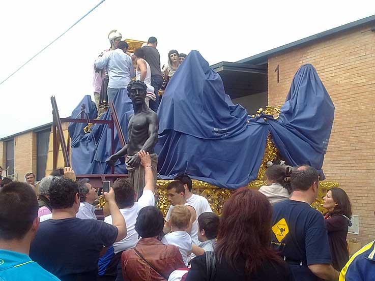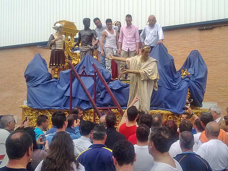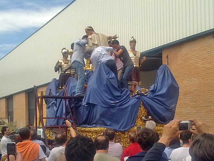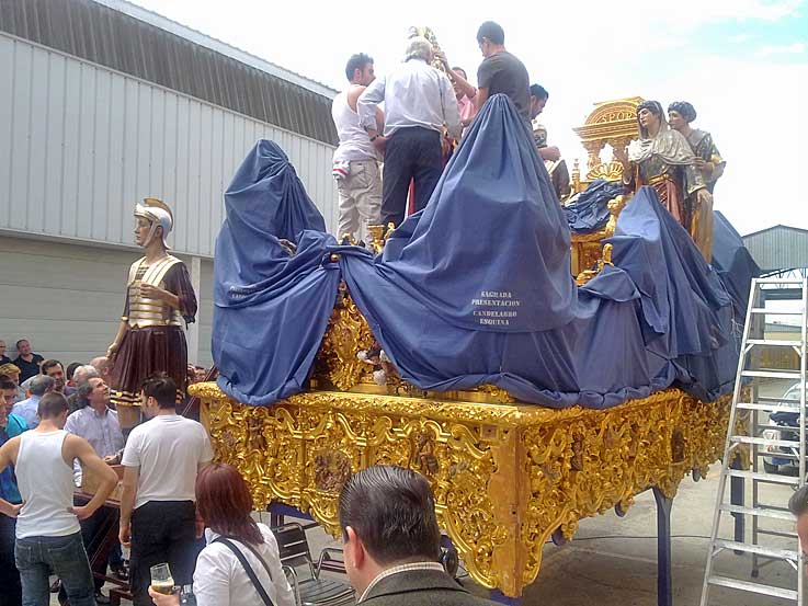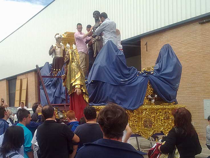 14 de Junio de 2016 Para no caer en reiteraciones innecesarias y para que se pongan en situación antes de seguir leyendo deberia ver ( o volver a ver ) para recordar, el "capítulo" anterior : MUDÁ "HISTÓRICA" EN SAN BENITO .- Si en el enlace anterior veía la salida , aquí gracias la materila gráfico que me ha proporcionado un buen amigo , vemos la llegada a las naves de un poligono industrial donde estuvieron los pasos, mientras duraron las obras de rehabilitación de la casa hermandad .- Como la nave en cuestión, cedida al efecto no tenia la suficiente altura en la puerta hubo que desmontar y bajar todas las figuras secundarias del Misterio de la Presentación al Pueblo , e ir depostandolas una a una en su interior, dando lugra a estas curiosa imágenes .- Aquí se pueden ver la figuras ya en el suelo y debidamente tapadas Cuando se finalizó el desmontaje de la figuras secundarias de procedió a meter el paso de misterio en la nave como pueden ver en el siguiente video desde dos ángulos diferentes : .-