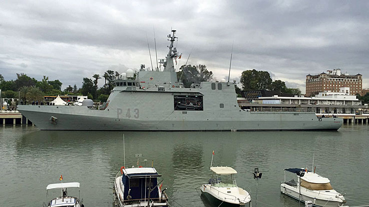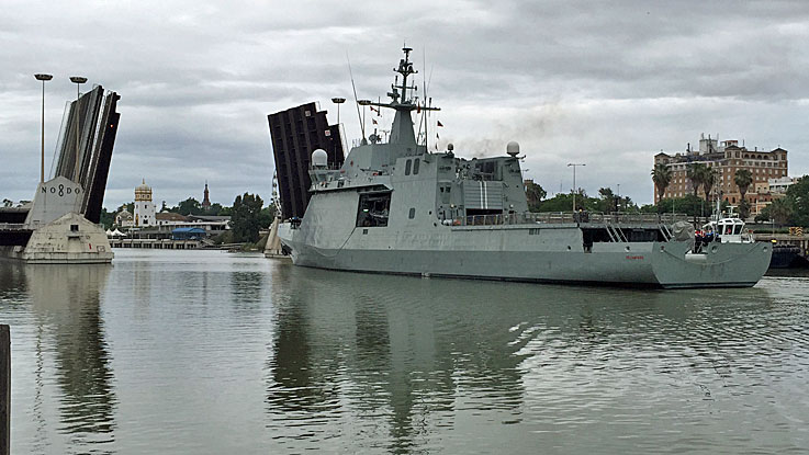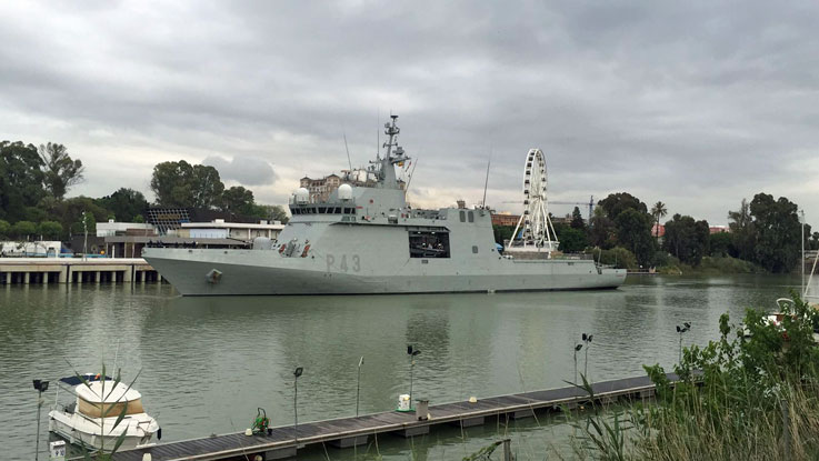 7 de Mayo de 2016 El Buque de Acción Marítima ‘Relámpago’ llegó ayer al puerto de Sevilla, muelle de Delicias, a los sones de "Ganando Barlovento". El buque de la Armada llega tras finalizar su calificación operativa en aguas de Cartagena y Cádiz en las que se ha visto sometido a un exigente programa de certificación previo a su despliegue en septiembre de este año en la “Operación Atalanta” de lucha contra la piratería en aguas del Océano Índico.- Durante su estancia en Sevilla, el ‘Relámpago’ realizará jornada de puertas abiertas en la que el público que lo desee podrá visitar el buque los días 7 y 8 en horario de 10.00 a 13.00 horas y de 15.30 a 19.30. La visita consistirá en un recorrido por diferentes compartimentos del barco, donde se explicarán las capacidades y cometidos del buque y se mostrará parte del material empleado para el cumplimiento de sus misiones. Una vez se haga a la mar, el buque comenzará su tránsito a su puerto base en Las Palmas de Gran Canaria donde continuará con sus cometidos de vigilancia y seguridad marítima que se desarrollan cada día en las aguas de soberanía e interés nacional. Características del buque El ‘Relámpago’ es el tercero de la primera serie de cuatro Buques de Acción Marítima (BAM). Está concebido como patrullero oceánico y cuenta con un alto nivel de automatismos, que le permiten ser operado por una dotación de entidad reducida. Los BAM son buques de altas prestaciones, costes de adquisición y mantenimiento reducidos y gran nivel de polivalencia, no sólo en el ámbito militar sino también en el de cooperación en tareas de salvamento, lucha contra la contaminación, evacuación y ayuda humanitaria. Son buques de construcción totalmente española según parámetros de máxima eficiencia que han demostrado su plena operatividad y polivalencia en operaciones internacionales como la “Operación Atalanta” de lucha contra la piratería .-