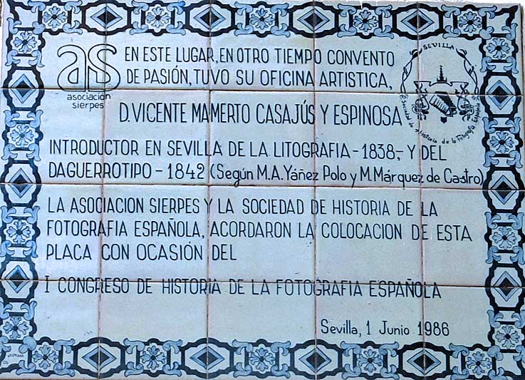 En un lugar recoleto de la centrica calle Sierpes de Sevilla , hay un azulejo que nos informa de como un señor en una época donde no había móviles, cámaras digitales , ni analógicas, ni "adobo fotochó", fue uno de los pionero en fotografiar los monumentos de Sevilla , con una técnica revolucionaria para la época . Como consta en el azulejo :