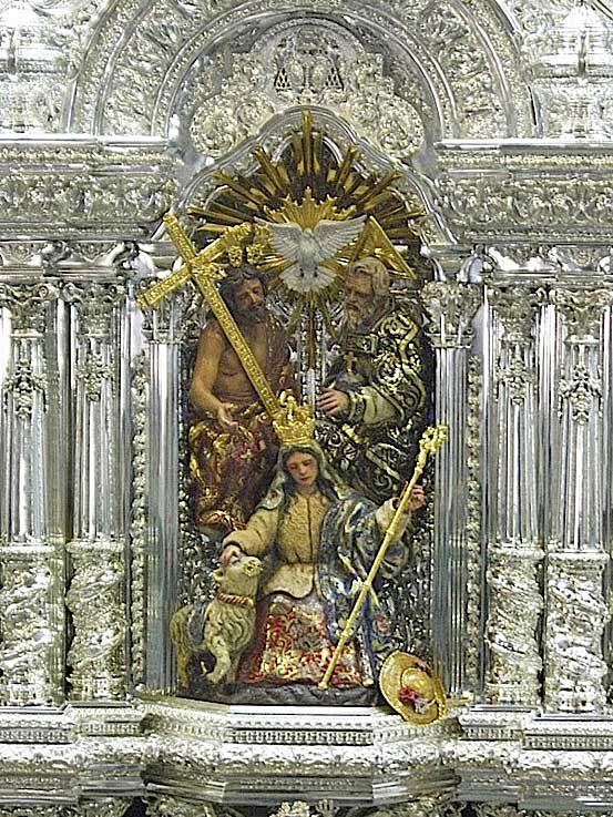 Como usted sabrá (o no), hoy se celebra la festividad de la Realeza de María , a los siete días de la festividad de la Asunción ( 15 de Agosto, la virgen de los Reyes es el 7 de Agosto ) . Hoy les he traido un recorrido por su representación iconográficas ( Dios y Jesuscristo sosteniendo la corona sobre la cabeza de la Virgen ), y lo vamos hacer modelo concurso, usted ve la foto , le dejo una pequeña pista , y las respuestas están al final . No haga trampas y ponga a prueba sus conocimientos cofradieros ( no es muy dificil ) .-