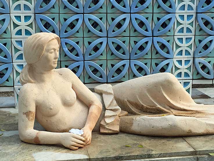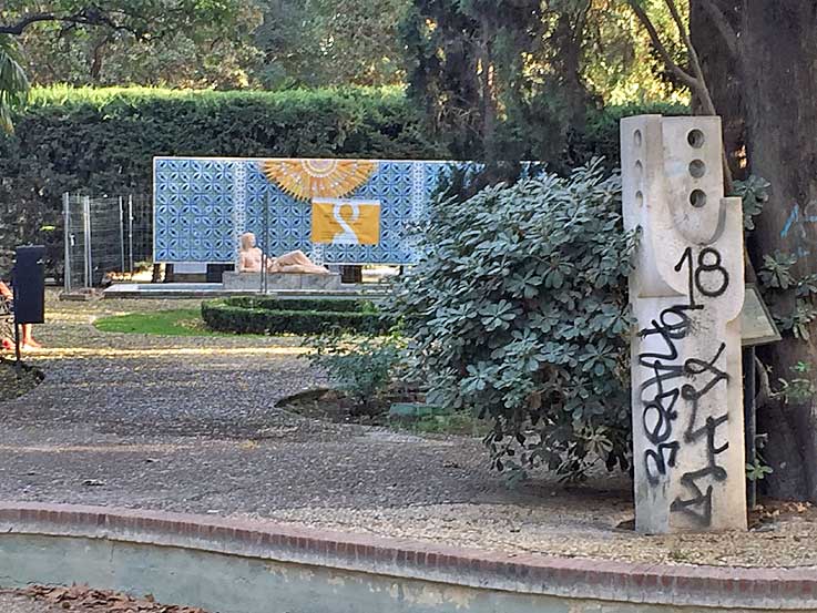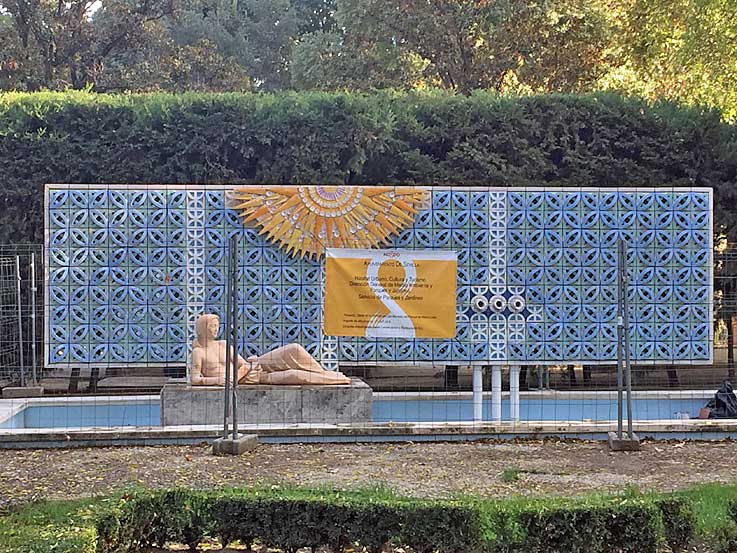 Todavía no les ha dado tiempo de limpiar la mierda de pintada grafitera ( cultura urbana) del monolito , y el estanque mas que de agua, es un estanque de hojas muertas, en proceso de putefracción .-