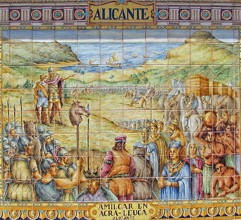Curiosa representación cruel hacia un caballo en una ciudad como Sevilla , en este azulejo de la Plaza de España ( donde siempre hay cosas por descubriri ) que representa la llegada del general cartaginés Almicar ( el papa del que fuera mítcio Anibal ) , fundando Acra Leuca ( que luego sería Alicante ) que realemnte era una base militar cartaginesa, para lamerse la heridas , despues de los romanos le hubiera partido bien la boca en la primera Guerra Púnica .-