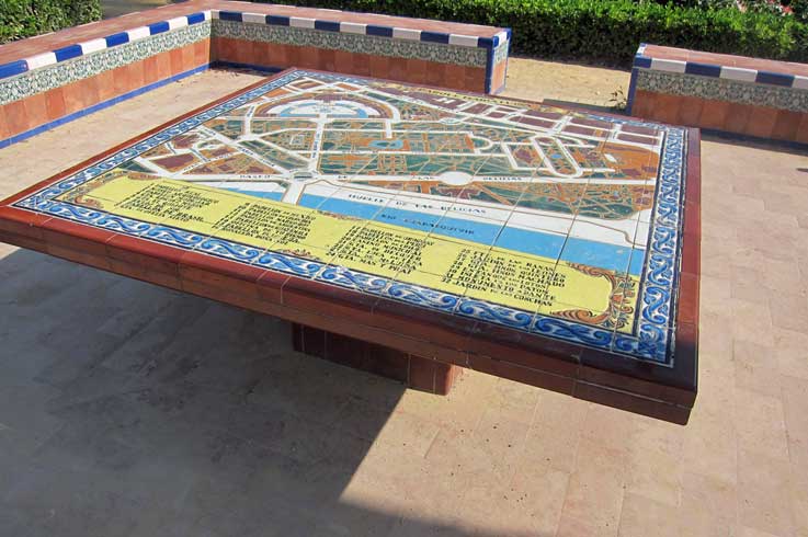 En el maltratado Parque de Maria Luisa de Sevilla, concretamente en la Plaza de Ámerica , nos encontramos con este pequeño espacio de forma cuadrada delimitado por unos bancos de baldosas y azulejos con forma de ángulo recto.. En su centro existe una gran mesa que le da nombre a la glorieta. Ésta consta de una plataforma revestida por un mural de azulejos donde se representa el plano de la Exposición Iberoamericana de 1929 en una época que no había GPS, ni Google Maps ( y aún asi hay extranjeros que se pierden ) .-