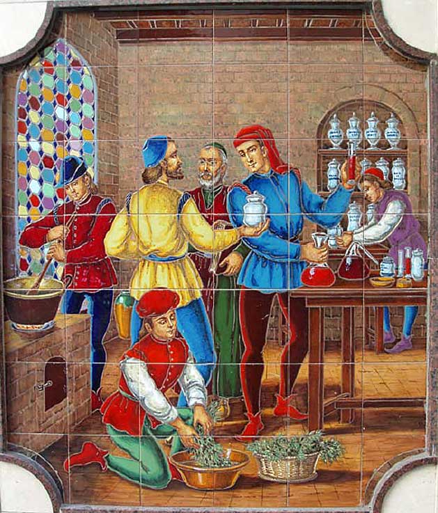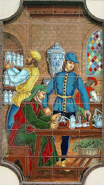 de azulejos que recrean escenas de boticas mediavales , como las que vemos