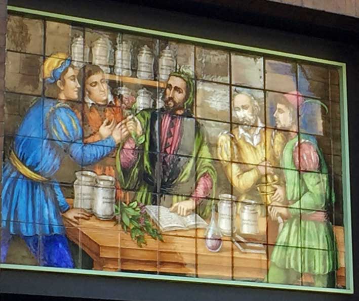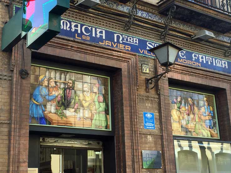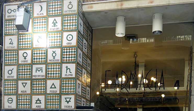 Muy curioso la farmacia de la calle Tetuán donde su fachada esta decorada con azulejos con elementos de la tabla periodica ( y no periodica como el fuego, agua, tierra , etc ) .-