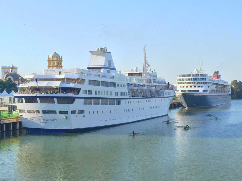 18 de Junio de 2017 Aunque ya es frecuente la visitas reiteradas de cruceros, ayer coincidian en el Muelles de las Delicias de Sevilla el crucero Aegean Odyssey , y el Braemar , dejándonos esta imagen tan marinera y refrescante en estos dias de verano adelantado , mas asfixiantes que calurosos . Como siempre les comento Sevilla no tiene costa pero si tiene puerto, al ser el Guadalquivir navegable hasta Sevilla .- Viendo estas imágenes se plantea uno, para cuando nos vamos a dejar de ecologismo radical y se va a realizar de una vez el mas que necesario dragado del rio para que puendan entrar esos grandes cruceros modelo bloques de pisos de varias plantas como se ven en los puertos de otras capitales europeas . no olvidemos que alguien que se baje de uno de estos barcos que ven en la foto, solo cruzando la acera están dentro del parque de Maria Luisa y la Plaza de España , y a escasos minutos ( con otras temperaturas ) puede ir perfectamente andando a la Catedral, Giralda y Alcazar , donde atracan practicamente en el casco historico de nuestra ciudad .- |