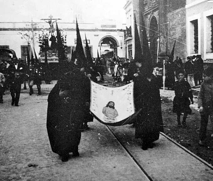 7 de Febrero de 2018 Leo en nuestra prensa local que la Hermandad del Buen Fin sacará una copia de la Sábana Santa en su cortejo del Miércoles Santo. La corporación franciscana recupera así junto a sus tramos a su titular originario, el Santo Sudario, tras la iniciativa impulsada por su actual junta de gobierno invocando una tradición del siglo XVII . La Autoridad Eclesiástica ha aprobado esta incorporación .- Supongo que se refieren a la Hermandad del Santo Sudario de Nuestro Señor Jesucristo y Madre de Dios de la Palma , a la cual en 1620 el ministro general de la Orden Franciscana fray Juan del Hierro hizo donación de una reliquia, con una reproducción del Santo Sudario que fue incluido como titular de la Hermandad , de la cual hay constancia que en 1670 salia procesionalmente portado por sacerdotes , Curiosamente al año siguiente en 1671 la Hermandad dejó de ser de penitencia, y se llamaria de la Esclavitud del Santisimo Sudario de Nuestro Señor Jesucristo, y Madre de Dios de la Palama , y se hacia una procesión claustral el Domingo de Ramos , con la reproducción del sudario portado por los frailes franciscanos .- Yo del siglo XVII no me queda ninguna foto , pero esto lo vimos unos pocos años por la Sevilla del siglo XX , de este tema ya les hablé en Nazarenos por calles desaparecidas . Si se fijan el paso no es un Crucificado solitario, es un Calvario cuando el Cristo de Burgos salía como un Misterio . Lo pueden ver en color en una acertada recuperación en un altar de Quinario de Enero del 2003 VER .- Si se fijan mas en lo cuatro nazarenos con vocación castellana , portan un lienzo a modo de reproducción del Santo Sudario, pintado por Carlos García Eris , decorado con flores y atributos de la Pasión , el cual sacaron por primera vez en 1919 .- Este singular cortejo desapareció, pocos años después, en 1927 ya que la Hermandad del Buen Fín, reclamó el título de Santo Sudario dejando de usarlo la Hdad del Cristo de Burgos , por lo que estan viendo es encuadrable entre 1919 y 1926 . Entre railes de tranvia y adoquines .- Todas las juntas de gobierno tienden a dejar su impronta ( la solución a este síndrome es el inmediato azulejo inmortalizador que ponga : "Esta junta no cambio nada y lo conservó todo que ya es bastante " ) , que se lo pregunten a las juntas que se van a cargar el Martes Santo, en el Santo Martes , haciendo estación de penitencia a una confiteria. Esto de sacar la reproducción de una reliquia , ( otra cosa son reliquias originales como ocurre en El Valle, Vera Cruz o La Sed ) como pueden ver, ya lo hemos visto, y tuvo una vida mas corta que larga ; pues puede que en el siglo XVII esto tuviera su aquél , hoy en el contexto de nuestra Semana Santa , esto de sacar reproducciones como que ya no pega mucho .- |