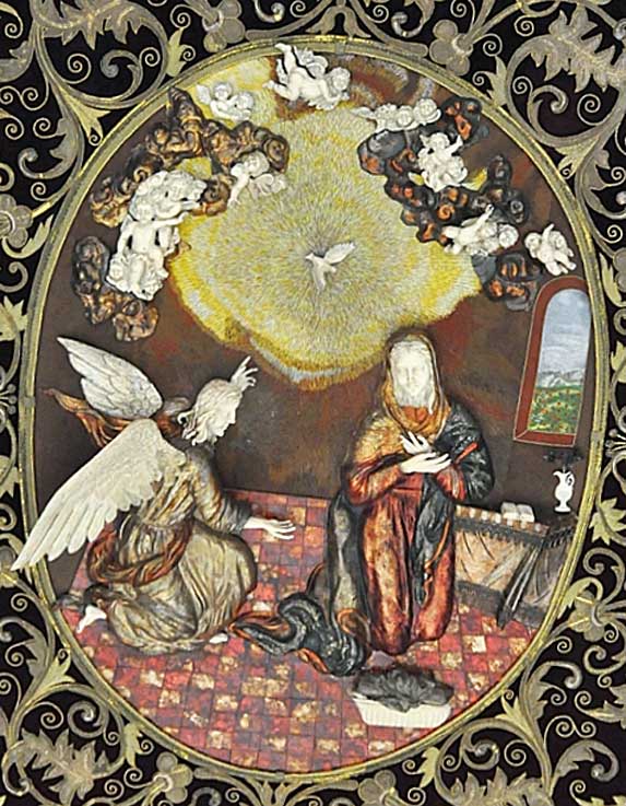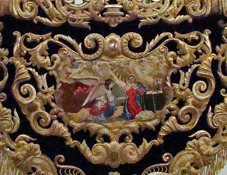 2 de Marzo de 2018 Por aquello de que estamos en Cuaresma y en el Año de Murillo, hoy les traigo una primera entrega de un pequeño juego de la presencia de cuadros de Murillo en los pasos de la Semana Santa de Sevilla que en su dia fueron inspiración de orfebres, bordadores , etc .- La mecánica de este juego es mas simple que el mecanismo de un búcarro, arriba les dejo el cuadro original , bajo él cual están rerepresentado cofradieramente usted tiene que adivinar en que lugar y que Hermandades son . Las respuestas están al final . No hagan trampas .- Primer cuadro La mal denominada Anunciación ( porque relamente representa el Misterio de la Encarnación ) obra de Murillo de 1660 , adquirida por Isabel de Farnesio ( aquimiseñora de Felipe V , posiblemente en su estancia en Sevilla, cuando nuestra ciudad fue Villa y Corte ) y hoy se encuentra en el Museo del Prado de Madrid