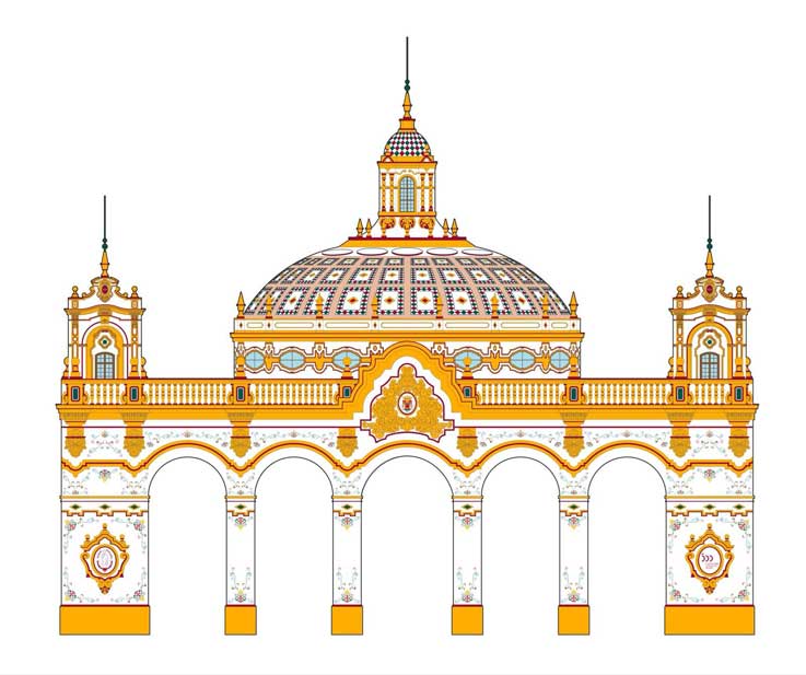 26 de octubre de 2018 Ayer fue presentada la portada de la Feria de Sevilla 2019 inspirada en el Casino de la Exposición y el Teatro Lope de Vega .- Uno cosulta las bases para la portada del año próximo : CONCURSO DE IDEAS SELECCIÓN DEL DISEÑO BASE DE LA PORTADA DE LA FERIA DE SEVILLA DE 2019 QUINTA.- Características de los diseños Las propuestas que se presenten deberán aportar singularidad y actualidad al diseño de portada del Real de la Feria y podrán estar inspiradas, en la arquitectura civil o en los conjuntos urbanos de carácter monumental de la ciudad. Estas referencias tienen carácter meramente indicativo. Como peculiaridad en el concurso de esta anualidad, las propuestas tendrán que tener referencias a la arquitectura de la Exposición Iberoamericana de 1929, al conmemorarse el 90 aniversario de ésta; así como a la figura de Aníbal González. También deberá reflejarse alguna alusión al V Centenario de la primera vuelta al mundo. Con esta suma de elementos