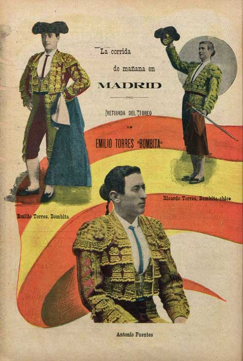 29 de Septiembre de 2018 Emilio Torres Reina llamado «Bombita» nació en Tomares el 28 de noviembre de 1874 fue un torero hermano mayor de otros dos matadores conocidos como «Bombita II» o «Bombita chico» y «Bombita III».- Presentación en Madrid en novillada: 8 de diciembre de 1892 en un mano a mano con Antonio Fuentes. Novillos de la ganadería de Vicente Martínez.- Alternativa: Sevilla, el 29 de septiembre de 1893. Padrino, «El Espartero»; testigo, Rafael Guerra, «Guerrita». Toros de la ganadería de Anastasio Martín.- Confirmación de la alternativa en Madrid: 27 de junio de 1894. Padrino, «Guerrita»; testigo, Antonio Fuentes. Toros de la ganadería de José Antonio Adalid..- Su habilidad con el estoque le permitieron gozar del favor del público y ocupar durante varios años las primeras plazas del escalafón, pero una grave cogida sufrida en Barcelona le obligó a poner fin prematuramente a su carrera, lo que hizo en una corrida celebrada en Madrid el 26 de junio de 1904. Reapareció en los ruedos en México en 1912 para participar en tres corridas, los días 18 y 25 de febrero y el 10 de marzo, tras de lo cual se retiró definitivamente. Fue el fundador de la dinastía de los Bombitas. Sus dos hermanos menores fueron también matadores con el mismo sobrenombre «Bombita»: Ricardo , conocido como «Bombita II» o «Bombita chico», que fue el más talentoso de los tres, y Manuel, Bombita III, que tuvo una corta carrera. Murió en Sevilla, en 1947 .- |