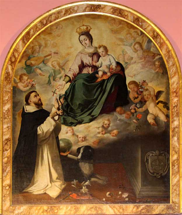 Representa a Santo Domingo de Guzmán , fundador de la Orden de Predicadores: la entrega del rosario por parte de la Virgen. La Virgen se apareció a este santo en una capilla en Prouille con un rosario en la mano, encomendándole su difusión. La escena está dividida en dos registros . En la parte inferior, se encuentra Santo Domingo arrodillado, que alza sus manos para recoger el rosario que la Virgen le ofrece. Delante del santo aparecen los símbolos característicos de su iconografía: la azucena, que representa la pureza, y un libro la Regla de los Dominicos.