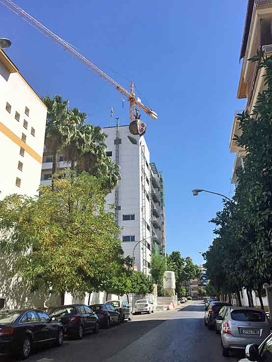7 de Julio de 2017 Si pasan por la avenida de Eduardo Dato a la altura del Hospital de San Juan de Dios o por la calle colindante veran que en la ampliación del hospital acaban de colocar en una de sus esquinas lo que a primera vista parece una granada gigante de proporciones importantes, que sin duda acabará siendo un referente urbano - Para no caer en innecesaria reiteraciones, aqui les dejo la explicación de esto, cuando les hablé del Callejón de los faisanes de Sevilla , pues se trata de la heráldica de la orden Hospitalaria de San Juan de Dios .- |