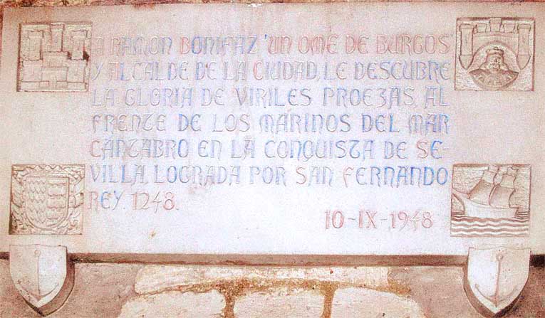 21 de Noviembre de 2018 Una amable lectora, me remite está lápida en este caso desde Burgos, que según me indica esta situada en el Arco de la Torre de Santa Marina relacionada con la Reconquista de Sevilla y nuestro amigo Bonifaz , que contiene el siguiente texto : A RAMÓN BONIFAZ