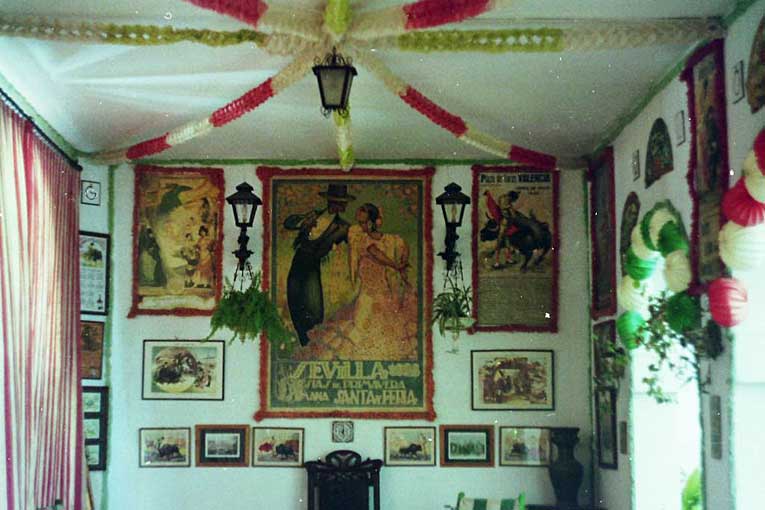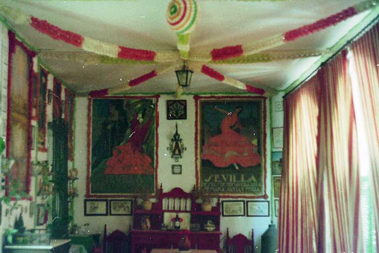 23 de Abril de 2020 Ayer, entre las tantas cosas que te envían por el móvil, me remitieron un simpática foto de una caseta que un vecino de Mairena del Alcor, Sevilla, ha montado en la azotea de su casa , ya que en estos días estarían de Feria , y en la que en su pañoleta le ha puesto el nombre de “Los Confinados” .- Esa foto me ha hecho viajar en el tiempo a la casa de mi tío Adolfo y mi tía Matilde, en pleno barrio de San Lorenzo (por la que pasaba cada año el Señor de Sevilla), donde nada más entrar, pensaba uno que estaba en el escenario de una obra de los Álvarez Quintero: un patio forrado de azulejos, mecedoras, agua manil, vargueños, arcones, columnas, aspidistras ( se pronuncian pilistras) , costillas de Adán, palmeras… cubierto por una enorme montera, y un principal con una galería forrada de cierros de cristales .- Mi tío Adolfo y mi tía Matilde eran muy empáticos (antes de que se inventara esa palabra) y tenían una intensa vida social, y les gustaba recibir a sus amistades, que tenían repartidas por todo el mundo (en el sentido literal de la palabra), en su casa , pero en un sitio muy especial: en la azotea. Y esto era porque allí tenían montada permanentemente una caseta de Feria, con todos sus detalles por dentro y por fuera, para asombro de todos los que eran invitados, siempre que el tiempo no lo impedía y acompañaba . La pueden ver en las fotos .-