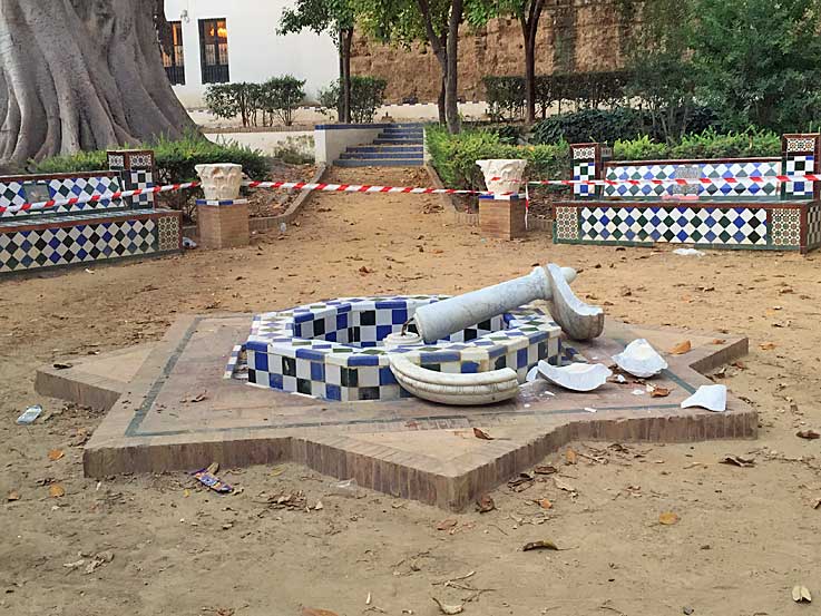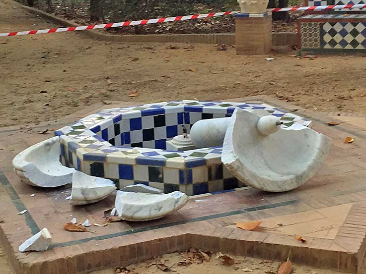 Cuando me venía de vuelta de hacer estas triste fotos pensaba , por lo menos han destrozado una fuente, podría ser peor, podrían haber destrozado a una persona con total impunidad , con total falta de vigilancia sobre la zona como ya ocurrió en su día cerca de este lugar EL CRIMEN DE LA MOVIDA .- En Sevilla al día de hoy los parque publicos son peligrosos, los frecuentan este tipo de alimañas, y aunque me repita no hay control ni vigilancia alguna, pues esto ha nadie le importa, ni le preocupa, ni da votos, (solo nos acordamos de ellos, cuando ruedan alguna pelicula o serie como Juego de Tronos, de los que estos jardines fueron escenarios ) . No se confien, lleve cuidado .- |