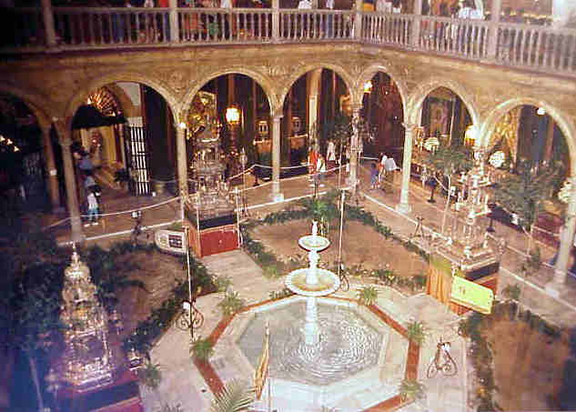 Haciendo unas fraternales correcciones en Cristo , eso de "por vez primera" , hay que comer más rabitos de pasa, para fortalecer la memoria . Por vez PRIMERA VEZ DE VERDAD , cuando hubo una magna exposición de todo el mundo cofradiero de Sevilla, fue durante la Exposición Universal de 1992, bajo el lema LOS ESPLENDORES DE SEVILLA , dividida en tres areas : La Pasión, en la Iglesia del Salvador , con pasos de penitencia y sus Sagrados Titulares; Las Glorias en frente en la Iglesia de la Paz, y Los Tesoros en la sede central de la entonces Caja San Fernando de Sevilla ( hoy CajaSol) donde se reunió el patrimonio de todas las Hermandades de Penitencia, Glorias y Sacramentales , donde "el patio central un escenario de excepción" , ya fue un escenario de excepcion en 1992 .-( Los Tesoros y La Pasión ) ( Las Glorias ) Lo del nombre ‘In Nomine Dei, patrimonio artístico de la Semana Santa de Sevilla’ (haciendo alusión a una de las frases más representativas que se reflejan en la Giralda). En la Giralda lo que pone de verdad en sus cuatro caras "TURRIS (E) - FORTISSIMA (S) - NOMEN DNI (O)- PROVERB (N). 18" (cuya traducción al español es "La torre más fuerte es el Nombre del Señor").-
