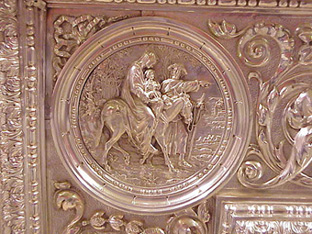 Esta cartela o medallón figura en una hermosa canastilla. Representa una hermosa e inusual escena de la Sagrada Familia donde la Virgen amamanta al Niño Jesus, bajo la mirada de San Jose la mula y el buey.- Posiblemente su autor Francisco Buiza se inspirara en el lienzo de Zurbaran titulado Un descanso en la huida hacia Egipto, donde la Virgen da el pecho al Niño Dios .- ¿Una pista?: La imagen del Señor en una de las unicas tres que tiene pestañas |