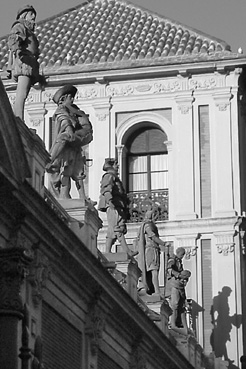 | JULIO DOMINGUEZ ARJONA Un buen test de sevillanía , sería que se apostará alguna rutilante locutora de nuestras televisiones locales frente al palacio de San Telmo, y tratarán de identificar las estatuas de los llamados doce sevillanos ilustres , y estoy por asegurar que de tres no pasaban.- Si se contemplan el conjunto monumental desde la acera de en frente ( con perdón ), de derecha a izquierda las estatuas serían las siguientes: Juan Martínez Montañés, escultor que porta en una mano la cabeza de un Cristo; Rodrigo Ponce de León, Marqués de Cádiz y capitán general de la Reconquista de Granada . que está apoyado sobre una enorme espada; Diego Rodríguez de Silva y Velázquez, pintor, con sus pinceles y paleta como lo veíamos en la Plaza del Duque; Miguel Mañara ( mal llamado "de Mañara") caballero , filántropo fundador del hospital de la Santa Caridad . llevando en brazos a un desahuciado de la vida; Lope de Rueda, nuestro Shakespeare español, dramaturgo, inventor de los entremeses , pequeñas piezas entre actos teatrales , no tapitas que nos ponen antes de almorzar y Diego Ortiz de Zuñiga y de Alcazar , esbozado en su capa . escritor e historiador sevillano; escribió entre otras obras , Anales eclesiásticos y seculares de la ciudad de Sevilla, 1677, una importante historia de nuestra ciudad, Fernando de Herrera, portando una lira ,uno de los poeta mas importante del Siglo de Oro y que si volviera a la vida le daría algo de ver la parroquia de San Andrés , de la que fue beneficiado; Luis Daoiz, militar héroe del 2 de mayo de 1808 , con un sable desafiando al viento; Benito Arias Montano. humanista y teólogo., consejero de Felipe II, , portando un libro; Bartolomé Esteban Murillo, pintor , situado junto a un gran cartapacio de dibujos; Per Afán de Rivera, duque de Alcalá que luchó en la Reconquista, con adarga y armadura y .Fray Bartolomé de las Casas , obispo de Chiapas México, y protector de los indios , protegiendo a un pequeño indígena.- Es curiosos, porque todos son sevillanos de nacimiento menos tres, Arias Montano de Fregenal de la Sierra; Rodrigo Ponce de León de Cádiz y Juan Martínez Montañés de Alcalá la Real, estos tres vivieron en algunas etapas de su vida en Sevilla, y los tres murieron en Sevilla .- Mas llamativo aún es que prácticamente es un monumento a un Siglo de Oro sevillano, pues todos, menos cinco, vivieron en el siglo XVI, abarcando todas las artes y humanidades. Las cinco excepciones son Ponce de León que vivió en el siglo XV, Ortiz de Zuñiga , Murillo y Miguel de Mañara en el siglo XVII, y el mas "moderno", Daoiz, en el siglo XVIII, principios del XIX.- El colmo de las curiosidades es que de