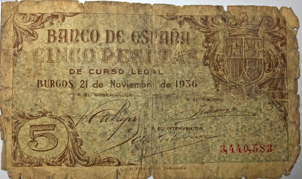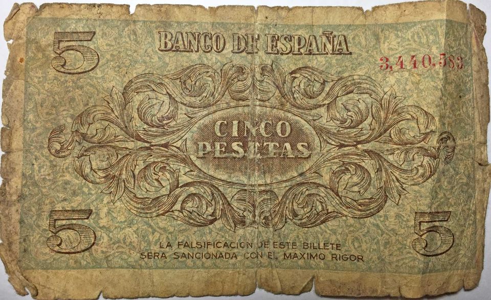 Escaso billete de 5 Pesetas emitido por el Gobiernos Español (Francisco Franco) por el Banco de España en Burgos el día 21 de noviembre de 1936 en plena Guerra Civil Española por eso es difícil de encontrar y están impreso en un papel alemán de baja calidad . Original, sin restauración alguna .-