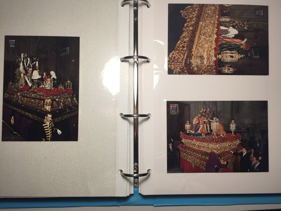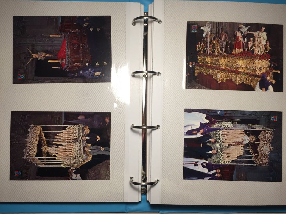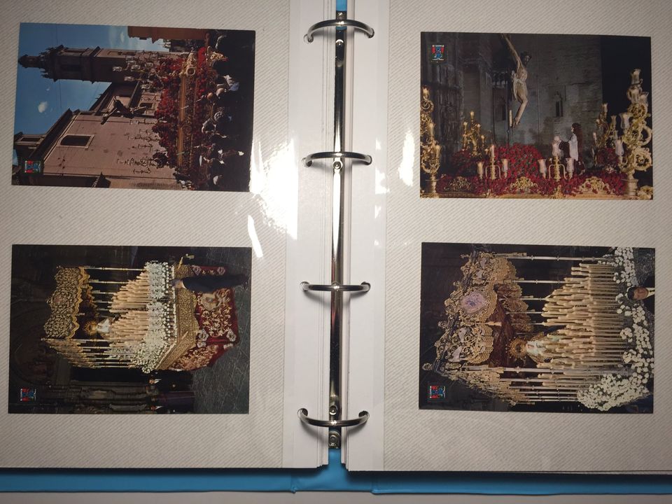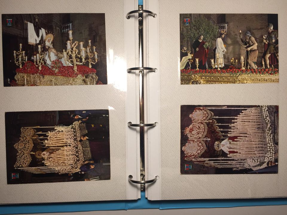 Colección de 75 postales de la Semana Santa de Sevilla de 1965 de las cuales 63 son de Escudo de Oro del fotógrafo José Antonio Viloria fotografiadas en el mismo lugar , en la Puerta de los Palos de la Catedral de Sevilla . Las otras 12 son del mismo lugar de la misma época . Se incluye álbum donde están perfectamente protegidas y catalogadas . No se vende por separado . Una pieza de colección .-