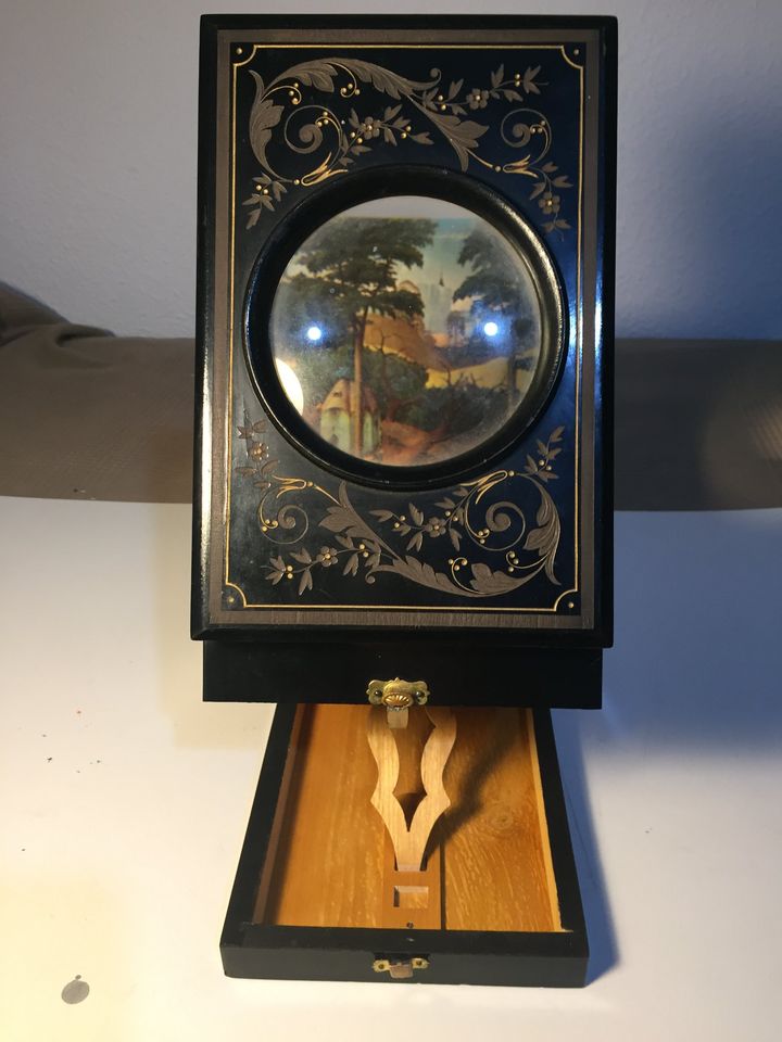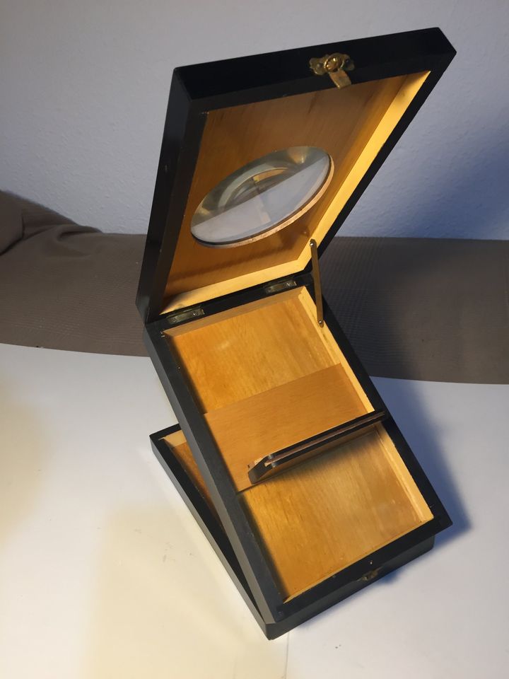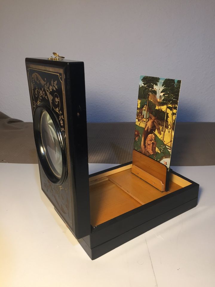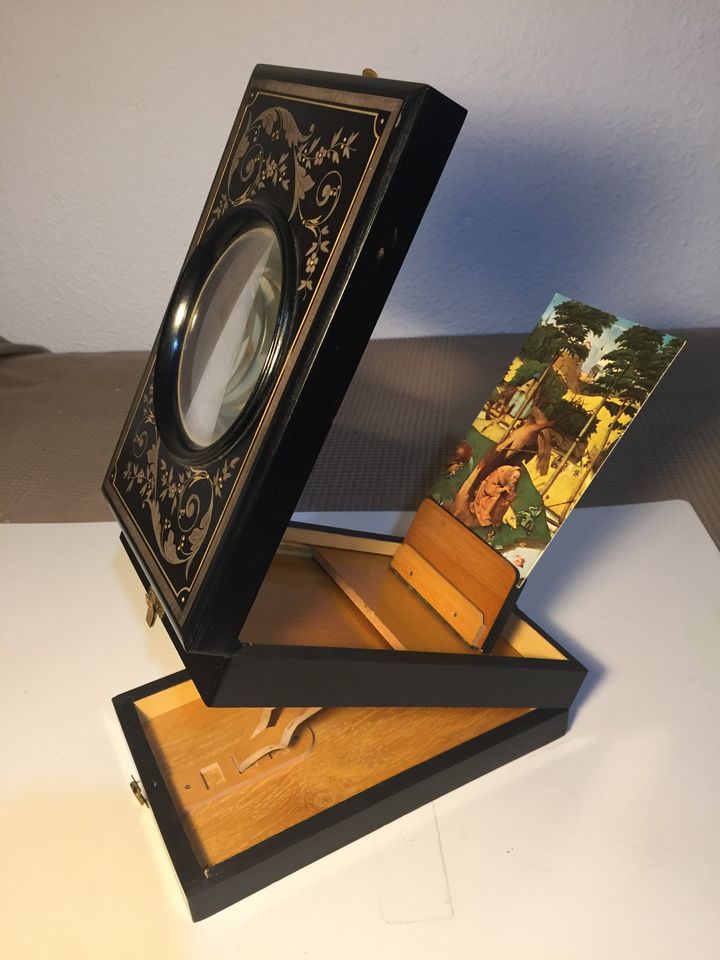 ES PLEGABLE Y DESPLEGABLE DE TRES PIEZAS ( VER FOTOS ). EL VISOR TIENE UNA GRAN LUPA PARA OBSERVAR LAS FOTOGRAFIAS COLOCADAS SOBRE UN SOPORTE DE MADERA , QUE SE PUEDE ACERCAR O ALEJAR DE LA LUPA AL ANTOJO .MIDE CERRADO 22 CM X 14,5 CM X 6,5 CM DE ALTO . LA LENTE MIDE 9,5 CM DE DIAMETRO .