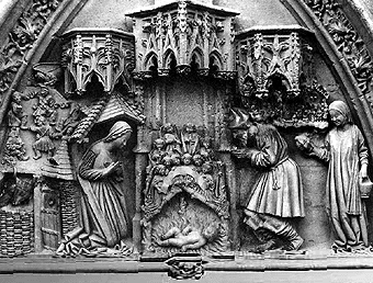 que recuerda a una escena cortesana , la estatuaria de su timpano , tambien