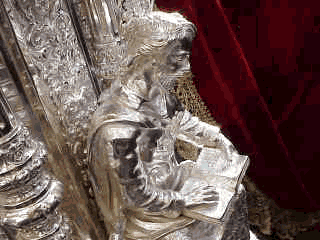 el caso es que en las hojas abiertas que parece leer el evangelista