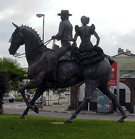 Un caballo de nuestra Feria de Sevilla, que porta jinetes, amazonas y grupas por el real con portes de auténticos centauros , escapados de poemas de Romancero del Ochocientos de Fernando Villalón Mi caballo se ha cansado/ mi caballo se ha dormido ......:Un caballo con un auténtico renacimiento del rejoneo moderno de Angel Peralta , que firmó en el albero maestrante tardes gloriosas del perfecta simbiosis entre el toro y el caballo: asi como Javier Buendia nos trajo los aires de la faena campera de garrocha y pañuelos atados a la chaquetilla. Unos caballos a la calesera de cascabales y borlajes de Casa Alba de la calle Francos, enganchados en tronco, en cuarta a la media potencia , en faetones, manolas o jardineras, que escapando a su marco feriante , crean una imagen irrepetibles , por jardines, plazas y monumentos de nuestra capital .- Un caballo al que en Mayo se le atará a la montura, la manta , el marselles de paño, y el capote , para cruzar las arenas de los caminos, la Raya, Palacio, Gelo, Juliana, Cuatrovitas,El Quema; en una geografia mas propia del Cielo que de la Tierra y que nos llevaran a su lomo a unas autenticas puertas del Paraiso en el Puente del Ajoli hacia Reina de las Marismas .- Un rio de caballos procedente de la vecina localidad de Dos Hermanas en torno a su reina la Virgen de Valme, llenara a Bellasvista , donde Sevilla se viste tambien de romera y en torno a su ermita se revivira años tras años las hazañas y devociones fernandinas .- Miles de coches de caballos en nuestra Feria y que tras dieciseis años consecutivos dan el mas verdadero pregón de enganches en nuestra Maestranza , como el mejor de los pregones feriantes o en otoño miles de caballos desde hace mas de once años en el Palacio de Congreso, creran una autentica Feria de Invierno sevillana ( por favor San Miguel ni me lo nombre ) .- Pues bien señores, con este auténtico curriculum equino , nuestro fiel compañero y amigo el caballo ¿ no se es mas que merecedor de un monumento en nuestra siempre Muy Desagradecida ciudad de Sevilla?.Que pedazo de monumneto le pordria haber construido nuestro Ayuntamiento , con la mitad, de la mitad, de las mitad de los trescientos millones que se gastaron en el pastiche cateto y pueblerino de San Miguel . Por un mas que merecido monumneto al caballo a nuestro CABALLO ANDALUZ en Sevilla.-