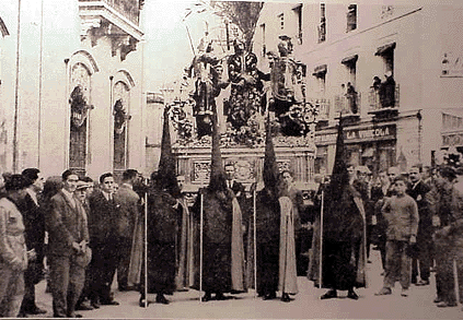 Sevilla 4 Septiembre 2001 El próximo 30 de Septiembre con la salida procesional de Ntra. Sra de Regla se conmemorará el cuatrocientos aniversario de la Hermandad de los Panaderos ; con tal motivo y como modesto homenaje ampliaremso el Coleccionable de La Sevilla que no vemos con dos entregas mas dedicados a dicha hermandad .- La fotografia de cabecera es digna de las mas detinada observación y comentario. La podemos situar en el tiempo a finales del los años veinte o principios de los años treinta del siglo pasado (XX), observese la indumentaria peinado de los transeuntes y el uniforme de gala de la guardia civil de escolta. En cuanto al lugar La salida de la calle Jesus del Gran Poder e inicio de la plaza del Duque , si se fijan en la foto a su derecha esta está el famoso local de la época Salon "La Vinicola".- En el centro del paso de Ntro Padre Jesus del Soberano Poder en su Prendimiento de la Hermandad de los Panaderos .. Lo primero que no llama la atención es que no aparece , el olivo en el centro aparece una palmera que posteror mente seria sustituida por el olivo. La presencia de la palmera en muchos pasos de la época estaba cargado de un fuerte simbolismo del caracter de martirio de la Pasion .- El paso de 1887 de Manuel Rodriguez . En cuanto al conjunto escultórico en primer lugar tenemos la figura de Ntro Padre Jesus del Soberano Poder en su Prendimiento de autor anónimo datado en el siglo XVII . Es de reseñar que esta imagen fue titular desde el siglo XVII hasta 1944. En la forografia vemos al Señor con una túnica del genial bordador Juan Manuel Rodriguez Ojeda, que no solo fue hermano de la corporación sino que participó muy activamente en la vida de la hermandad y su junta de gobierno .- En cuanto a las demas imagenes de la iconografia del prendimiento , contaba con tres soldados romanos y San Pedro, Santiago y San Juan obra de escultor Juan de Astorga Movado de 1819.- Pues bien todo esto que ustedes aqui ven dasapareceria en 1945 donde todo paso, figuras e imagen de Señor serian completamente renovado por el escultor e imaginero Antonio Castillo Lastrucci, dandole la imagen que hoy vemos en la actualidad .- La Semana Santa sevillana siempre igual, pero